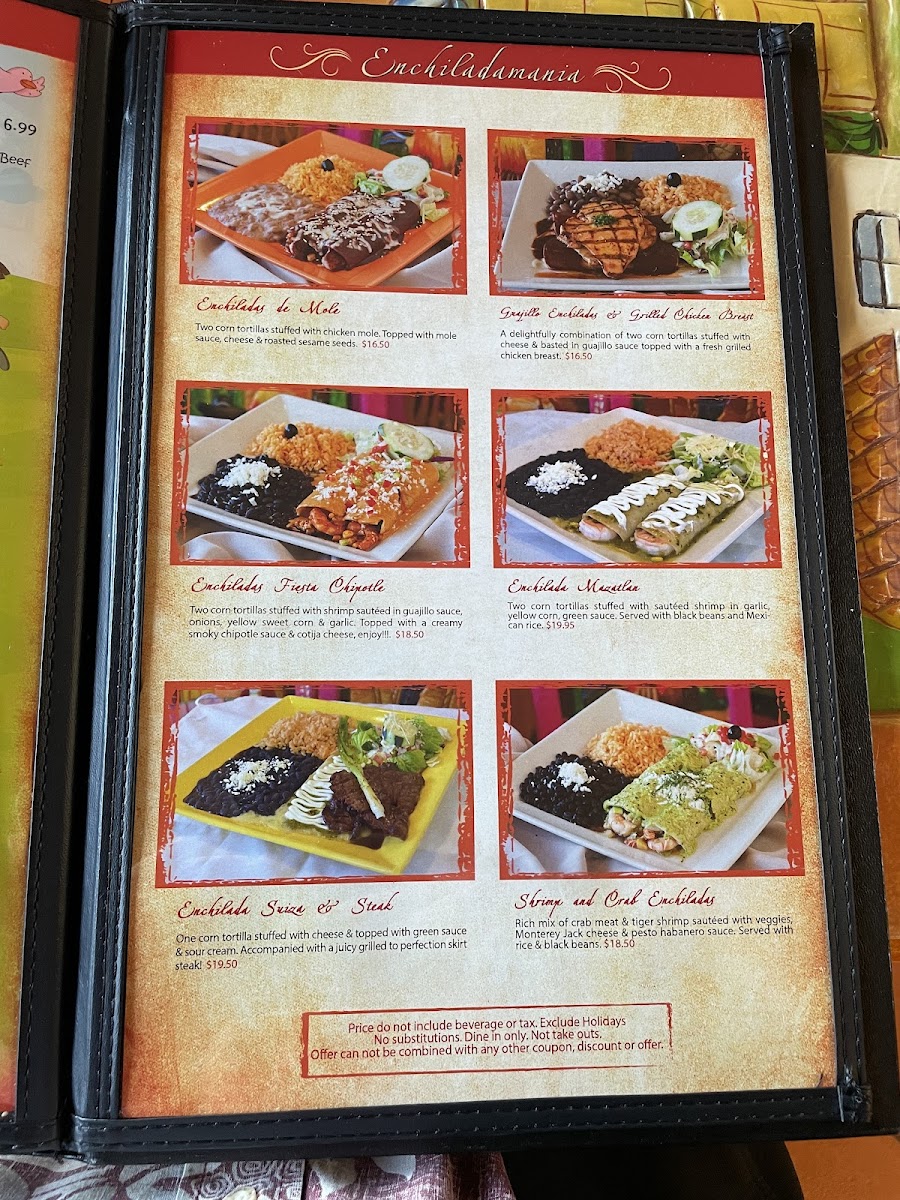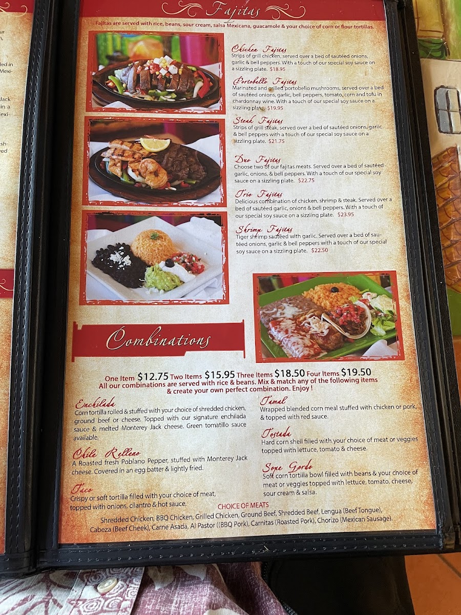 The menu is a delightful exploration of traditional Mexican fare, with standout dishes that encapsulate the essence of the cuisine. Start your culinary journey with the Chicken Fajitas, where perfectly grilled strips of chicken rest atop a bed of sautéed onions, garlic, and bell peppers, all served on a sizzling skillet that's a feast for the eyes as much as for the palate, priced at just $17.75. For a robust vegetarian option, try the Portobello Fajitas, featuring marinated and grilled portobello mushrooms intertwined with onions, garlic, and colorful bell peppers, drenched in chardonnay wine — a melody of flavors that embrace you with every bite.